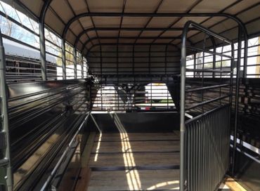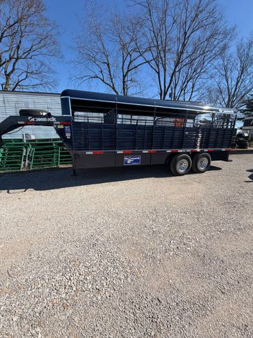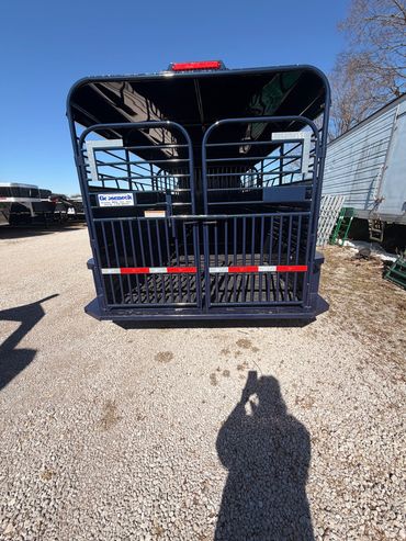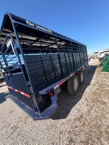Merrit Livestock trailer with punch sides, 3- 8000 lb torsion axles/electric brakes ST215/75R`7.5 16 ply tires with front vents 2 center gates with rub rail for fat cattle /extra marker lights and lighted sign box /slide and swing rear door with escape door